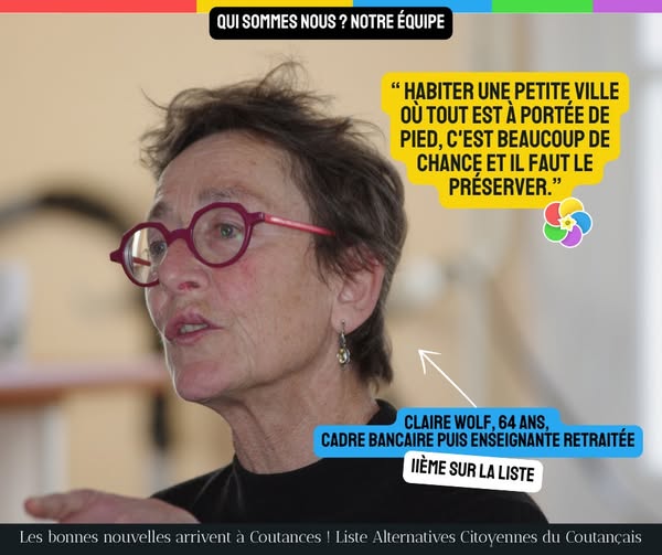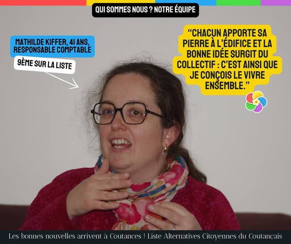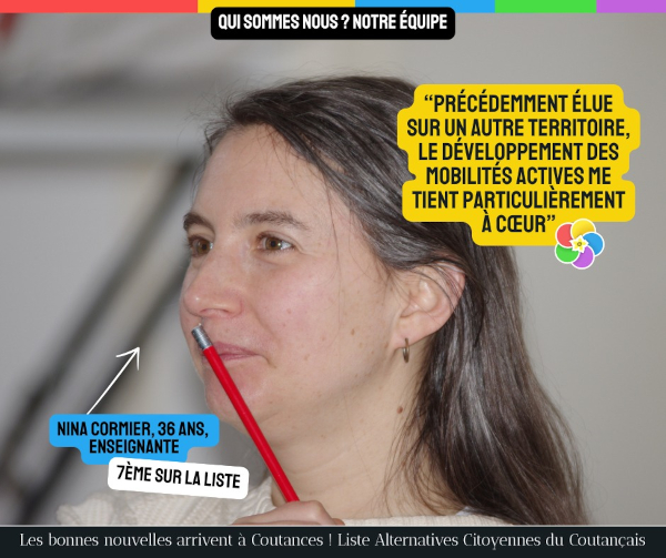 « Arrivée par amour il y a 2 ans à Coutances, mon engagement militant est lui plus ancien : d’abord adhérente des Jeunes Ecolos, dont j’ai été secrétaire fédérale avant d’atteindre l’âge de péremption, je milite depuis chez les Verts, dont je co-anime le groupe local. Élue conseillère municipale et communautaire en 2020 à Mulhouse sur une liste d’union de la gauche, c’est avec plaisir que je retrouve une telle dynamique à Coutances !