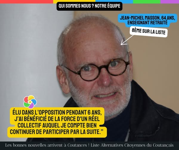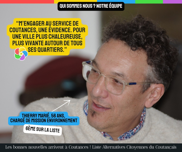 C’est pourquoi après un premier engagement avec Alternatives Citoyennes du Coutançais, j’aspire de nouveau à débattre, échanger et partager au sein de notre groupe et de notre commune pour améliorer notre belle cité ! »